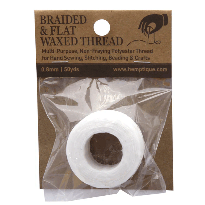 This white-colored thread is made from high-tenacity polyester fibers which are braided, non-fraying, waxed, and very strong.. For indoor or outdoor fabric repairs of canvas awnings, boat covers, and furniture upholstery. Also for leather stitching, bookbinding, bracelets, beading, crafts, and more.