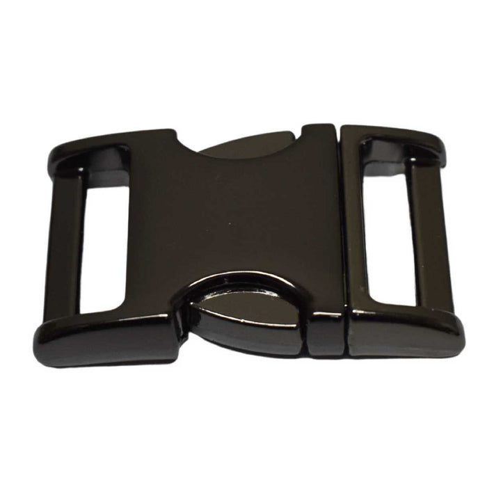High Polish Black 3/4" Nickel Plated Zinc Side Release Buckle. This attractive buckle is incredibly strong, opens easily and locks securely when closed. Used for survival bracelets, pet leashes, small belts or wherever a buckle is needed.