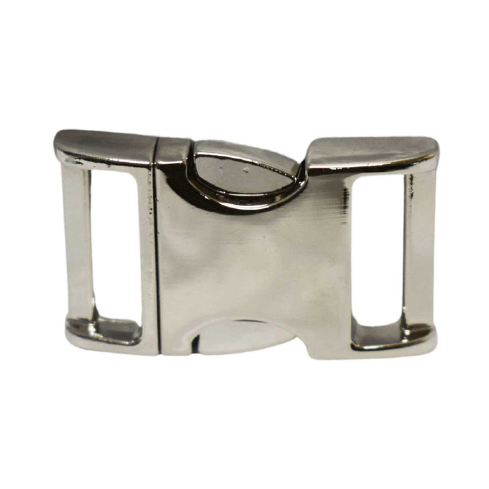 Silver 5/8" Nickel Plated Zinc Side Release Buckle. This attractive buckle is incredibly strong, opens easily and locks securely when closed. Used for survival bracelets, pet leashes, small belts or wherever a buckle is needed.