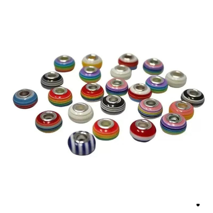 Multi-color, striped, resin bead with silver-plated brass lining in center. Hole size: 5mm. Fits 750 paracord and smaller. Beads come in variety packs with no guarantee of certain colors. (10 Pack).