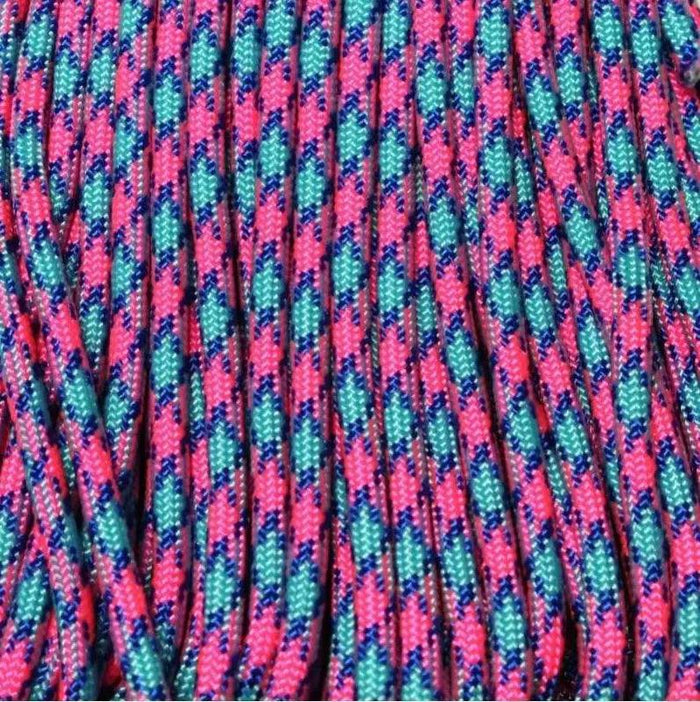 Pixie Stick (neon pink with baby and electric blues). This is type III 550 paracord which is strong, soft, smooth, and pliable. For key chains, lanyards, belts, slings, hammocks, shoe laces, gear repairs, survival bracelets, camping, everyday carry survival gear, crafting and household uses.